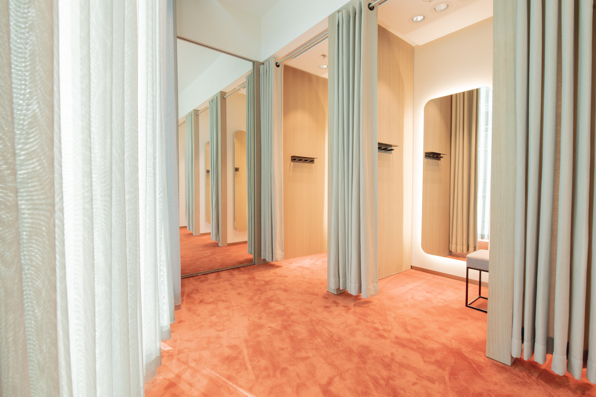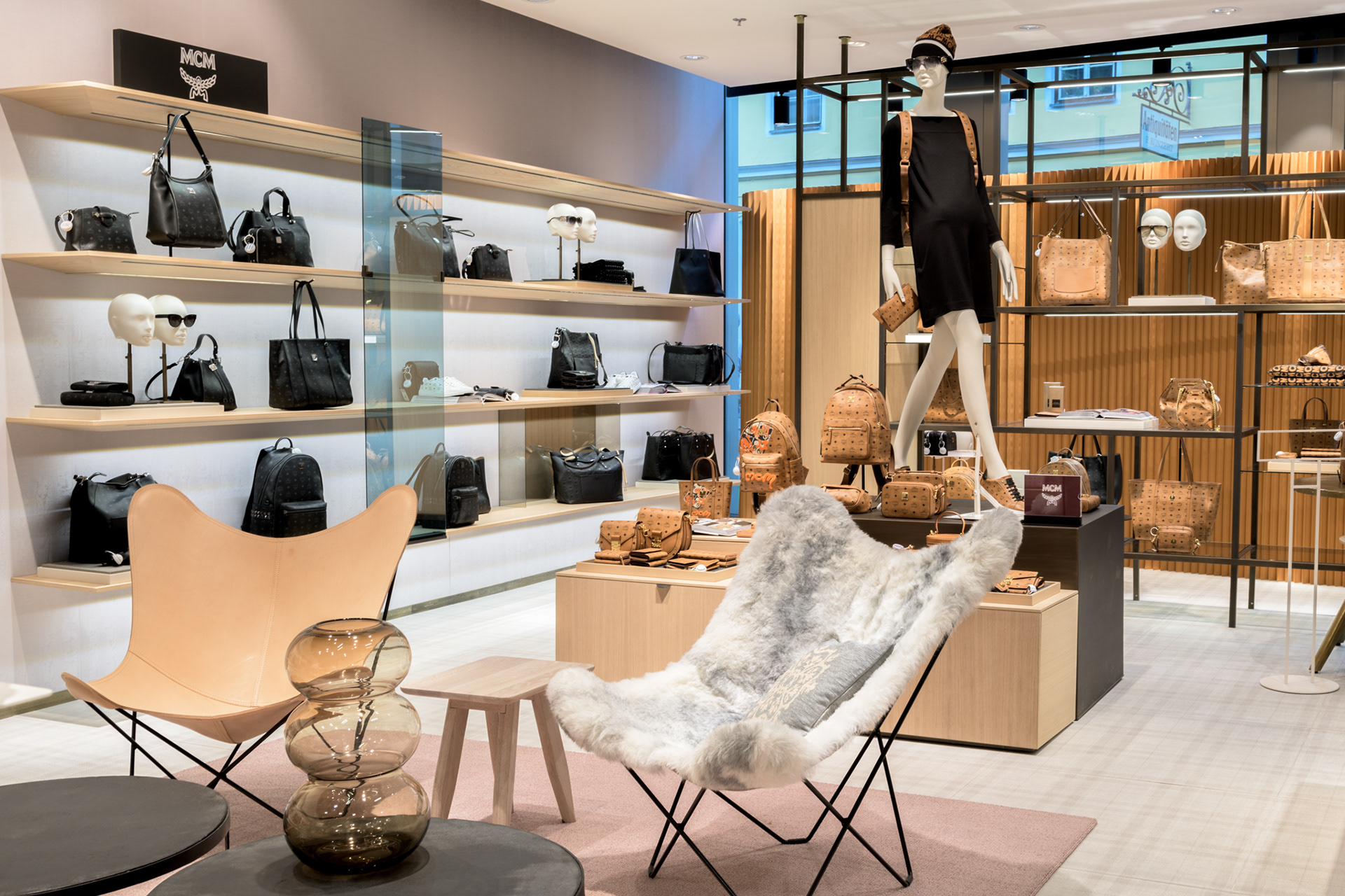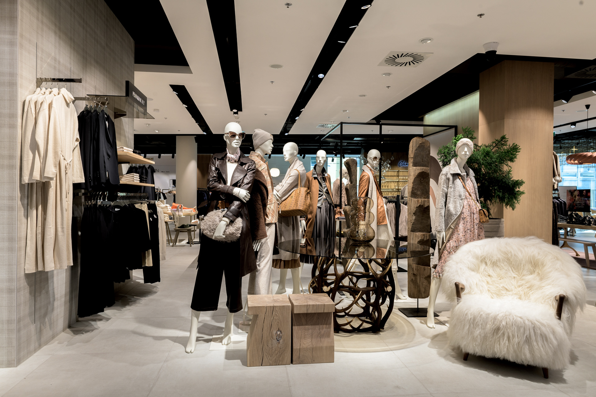 Auf den drei Geschossen mit insgesamt 6500 Quadratmetern präsentiert sich der Händler unter dem Leitmotiv „Urban alpin". Die kühn geschwungenen raumbildenden Elemente im Erdgeschoss sind das, was man große Geste nennt, während sich die Oberflächen aus Sandeiche in der Damenabteilung und der etwas kühleren Steineiche bei den Herren in natürlicher Zurückhaltung üben.