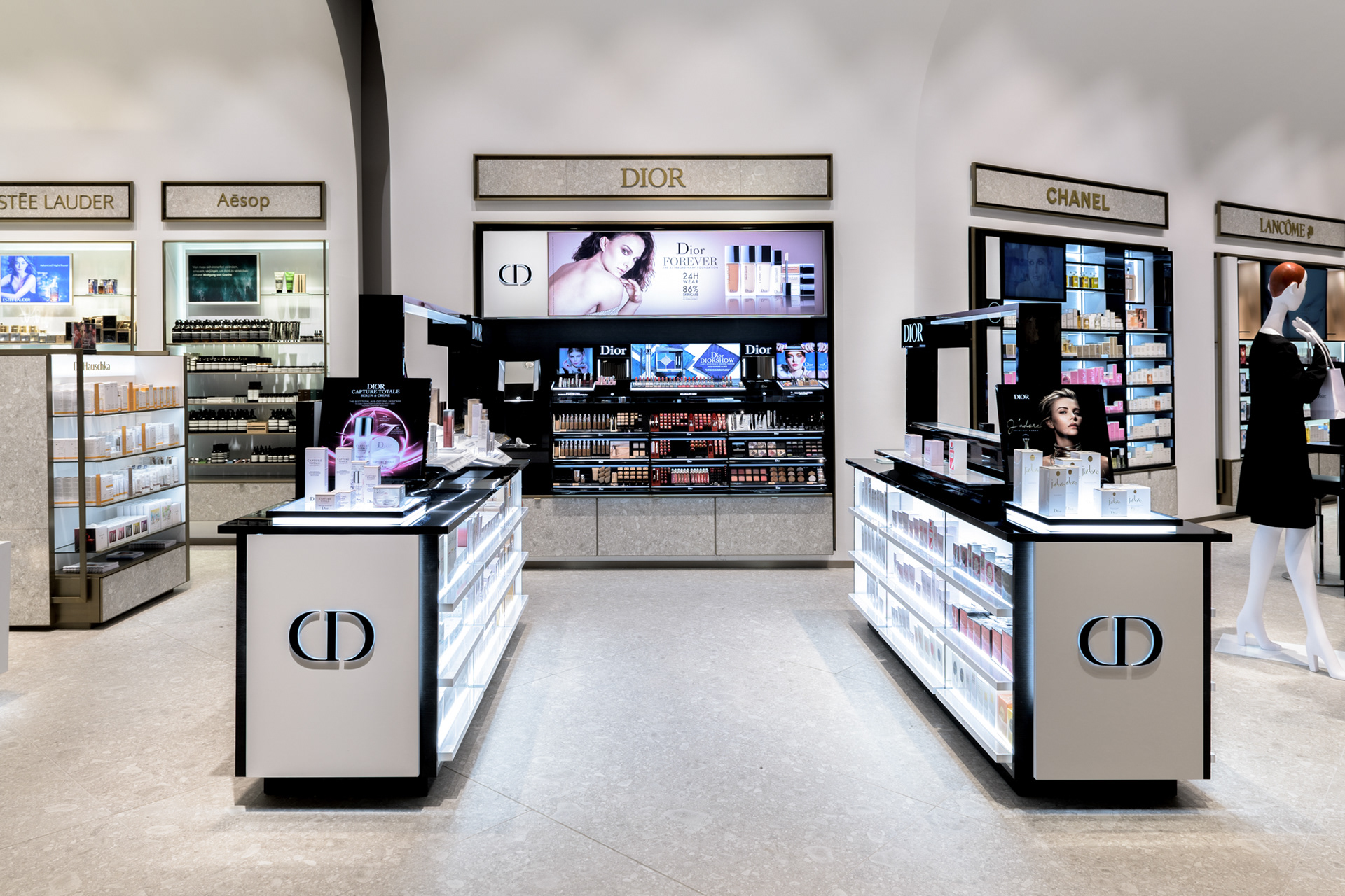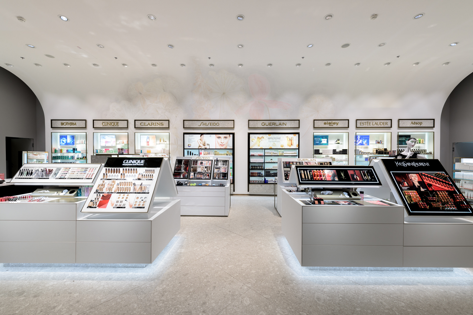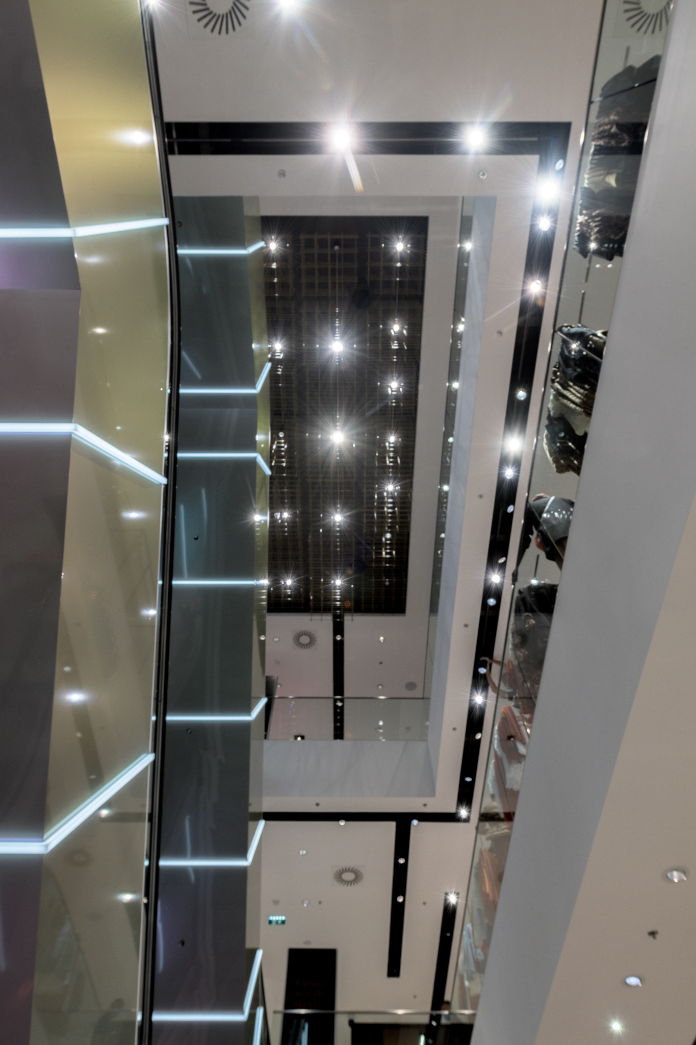 Auf den drei Geschossen mit insgesamt 6500 Quadratmetern präsentiert sich der Händler unter dem Leitmotiv „Urban alpin". Die kühn geschwungenen raumbildenden Elemente im Erdgeschoss sind das, was man große Geste nennt, während sich die Oberflächen aus Sandeiche in der Damenabteilung und der etwas kühleren Steineiche bei den Herren in natürlicher Zurückhaltung üben.